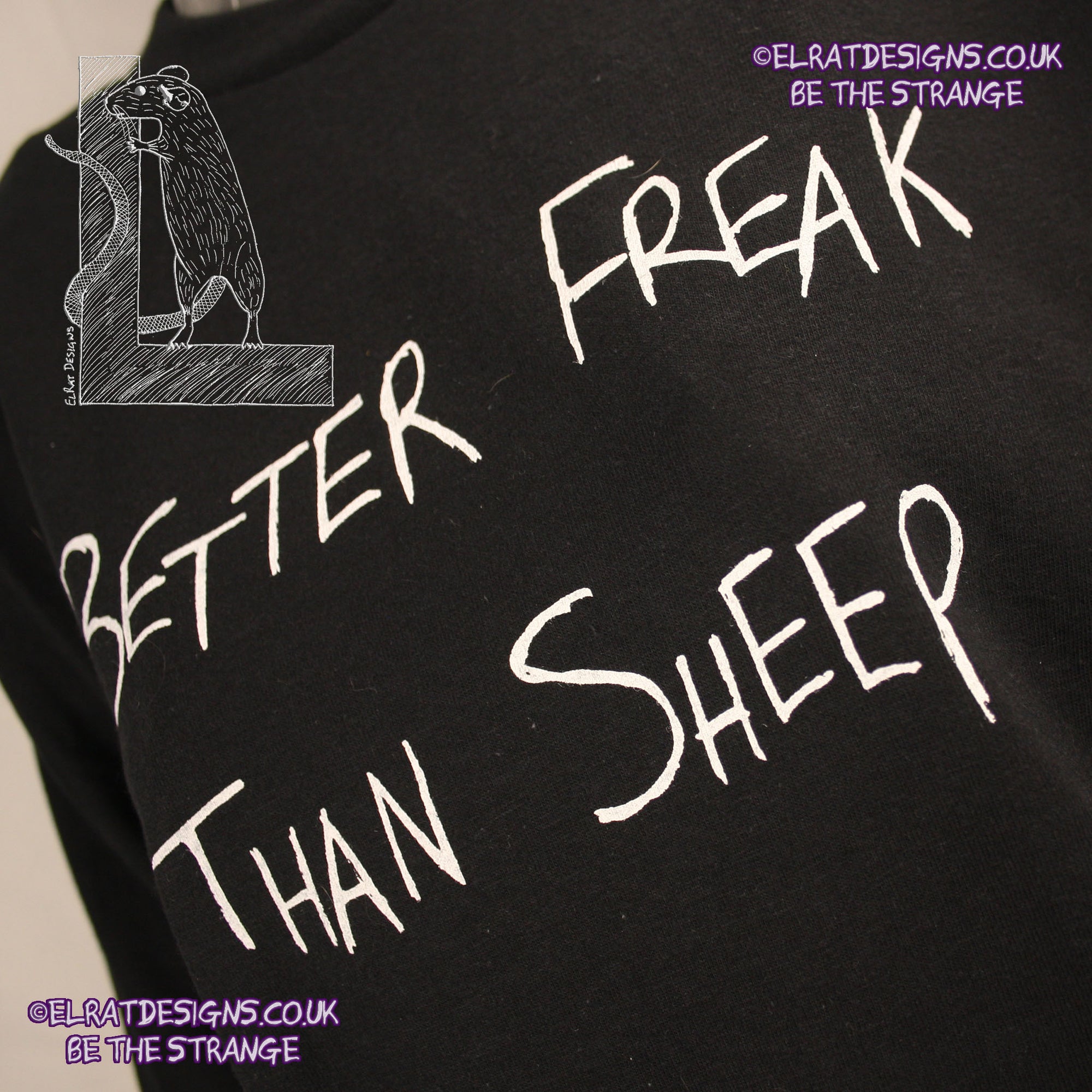 I remember, many years ago, I was walking home from work, (at the Independent record shop where I worked Saturdays, the same place I first heard Kristin Hersh by accident, it was a similar time to that too, around 1994) and some lads were walking the other way, and one of them leaned towards me and said "You really are a fucking freak" and I remember laughing and saying "Thank you!"... and he didn't know what to say, just kind of bumbled off with his mates... because... it wasn't bluster, the laugh was real, I took that as a genuine compliment... and in my mind, "Better Freak Than Sheep" was born. I have been writing and saying that ever since... I can't believe it took me 2 years of ElRat Designs to get it on a T-shirt....
