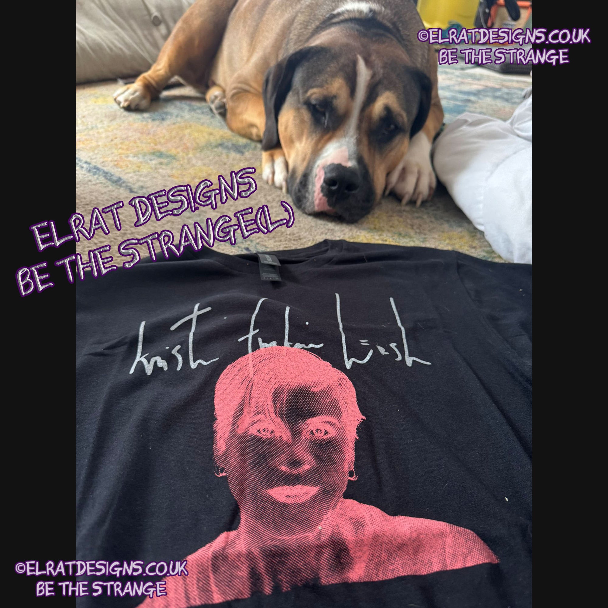Kristin fn Hersh, silver print, as handwritten by the one Hersh (you can get just the handwritten KFH here.) especially for ElRat Designs, with this excellent Kristin Hersh halftone clipping the lettering, in the most lairy "Fluorescent Red" (Yes, it looks pink to me too, but red is what it says on the tub, so to save myself confusion that's what I call it). Pictures on Mae Rose show it in daylight, 2nd picture shows it under blue/UV light. Every Hersh purchase directly funds Kristin Hersh studio time, helping to keep her in the studio where she belongs.