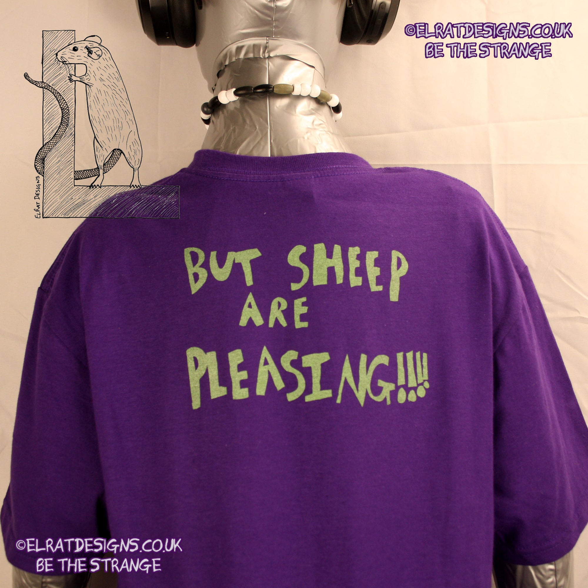 K'Rat-Horse has a love of Goats (Who wouldn't) She draws them all the time, so don't be surprised if there ends up being a range of Goat related shirts available. This is a thing she has been saying for a few years now, and her honest appraisal of Humans vs Sheep/Goats is both true, and brilliantly stated. Hand Printed by ElRat using the same eco friendly water based ink