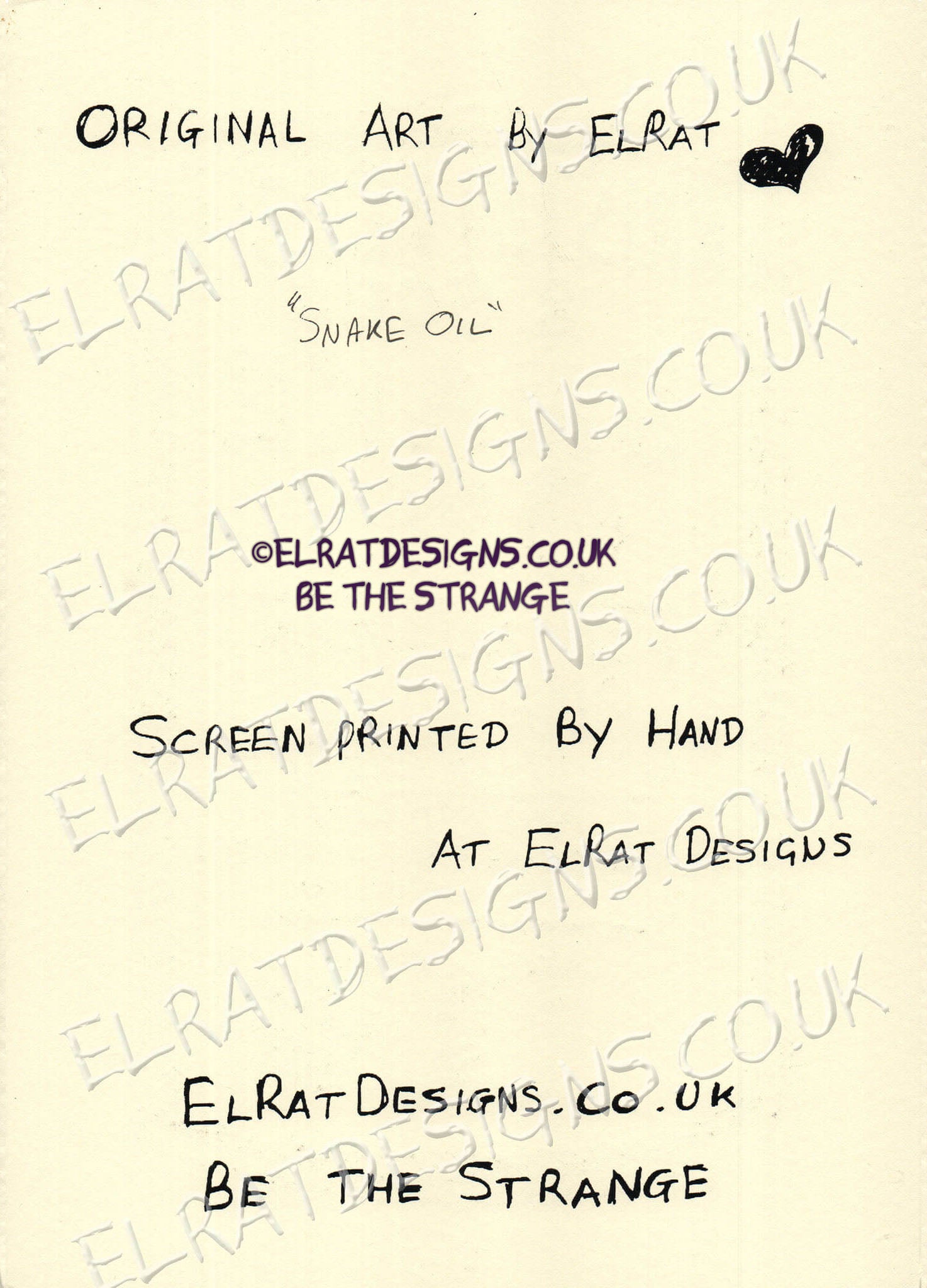 I am not some faceless company, I am a real person. Every print is hand pulled by me, using eco friendly water based ink. You can always speak to me at any point before, during or after your order is complete, and all items come with a money back guarantee. Every order ships in plastic-free packaging, I usually have some extras hanging around - test prints and the like, I love to send you something a little extra in your package. I always want ElRat packages to be a little sliver of light in the chaos, I only send packages, I would love to receive.
