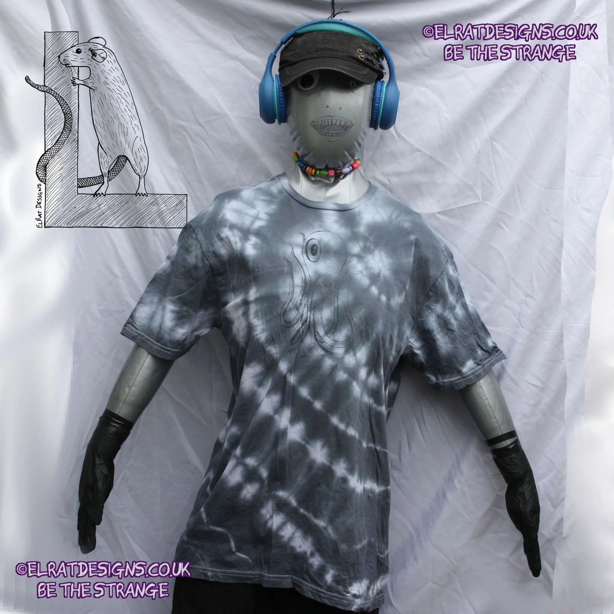 Octoclops Hand-Drawn Cephalopod Tee - Large #1 Misprint - White/Black Tie-Dye | ElRat Designs