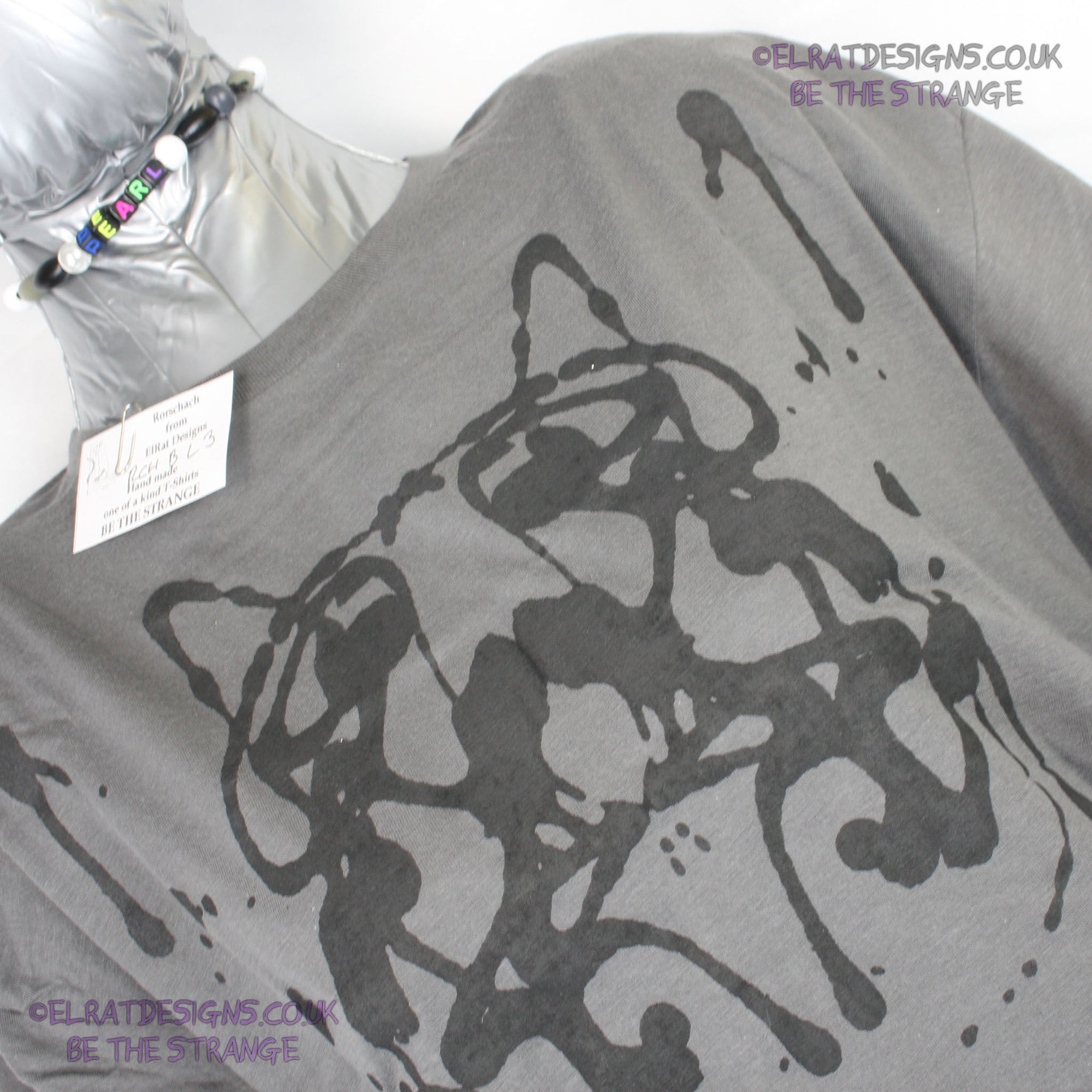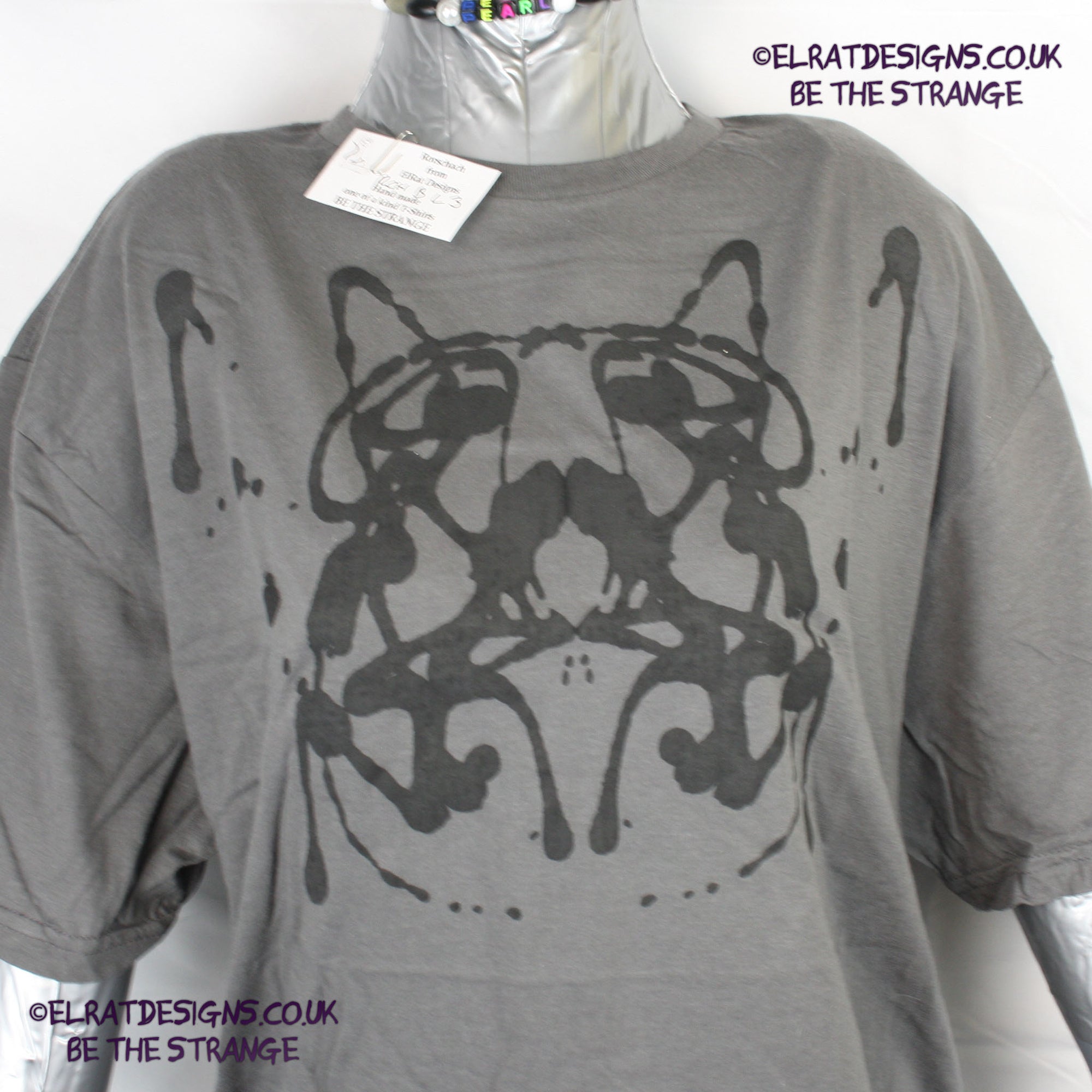 Many years ago I made myself a Rorschach T-shirt, I loved it, it sparked many interesting conversations but it was a pain to make, so for a long long time I was wondering how I could recreate this for other people. I finally cracked it . This is a genuine one-off ElRat Designs Rorschach ink blot t-shirt - there will never be another one exactly like this. Not screen printed, I use specially made foldable screens and let the ink create its own pattern, just like the original Rorschach test. What you see in the blot is a view into your mind - Everyone sees something, for some it's butterflies, others see faces, some see abstract shapes. In mine, I saw Walter White from Breaking bad, I made one for my kid, and it was a crab wearing a gas mask. There's no right or wrong answer.