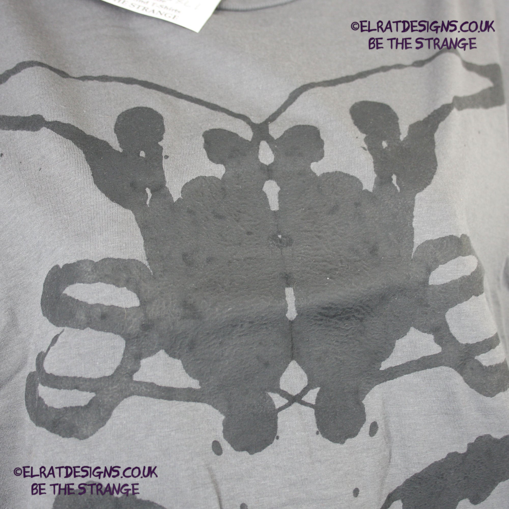 Many years ago I made myself a Rorschach T-shirt, I loved it, it sparked many interesting conversations but it was a pain to make, so for a long long time I was wondering how I could recreate this for other people. I finally cracked it . This is a genuine one-off ElRat Designs Rorschach ink blot t-shirt - there will never be another one exactly like this. Not screen printed, I use specially made foldable screens and let the ink create its own pattern, just like the original Rorschach test. What you see in the blot is a view into your mind - Everyone sees something, for some it's butterflies, others see faces, some see abstract shapes. In mine, I saw Walter White from Breaking bad, I made one for my kid, and it was a crab wearing a gas mask. There's no right or wrong answer.
