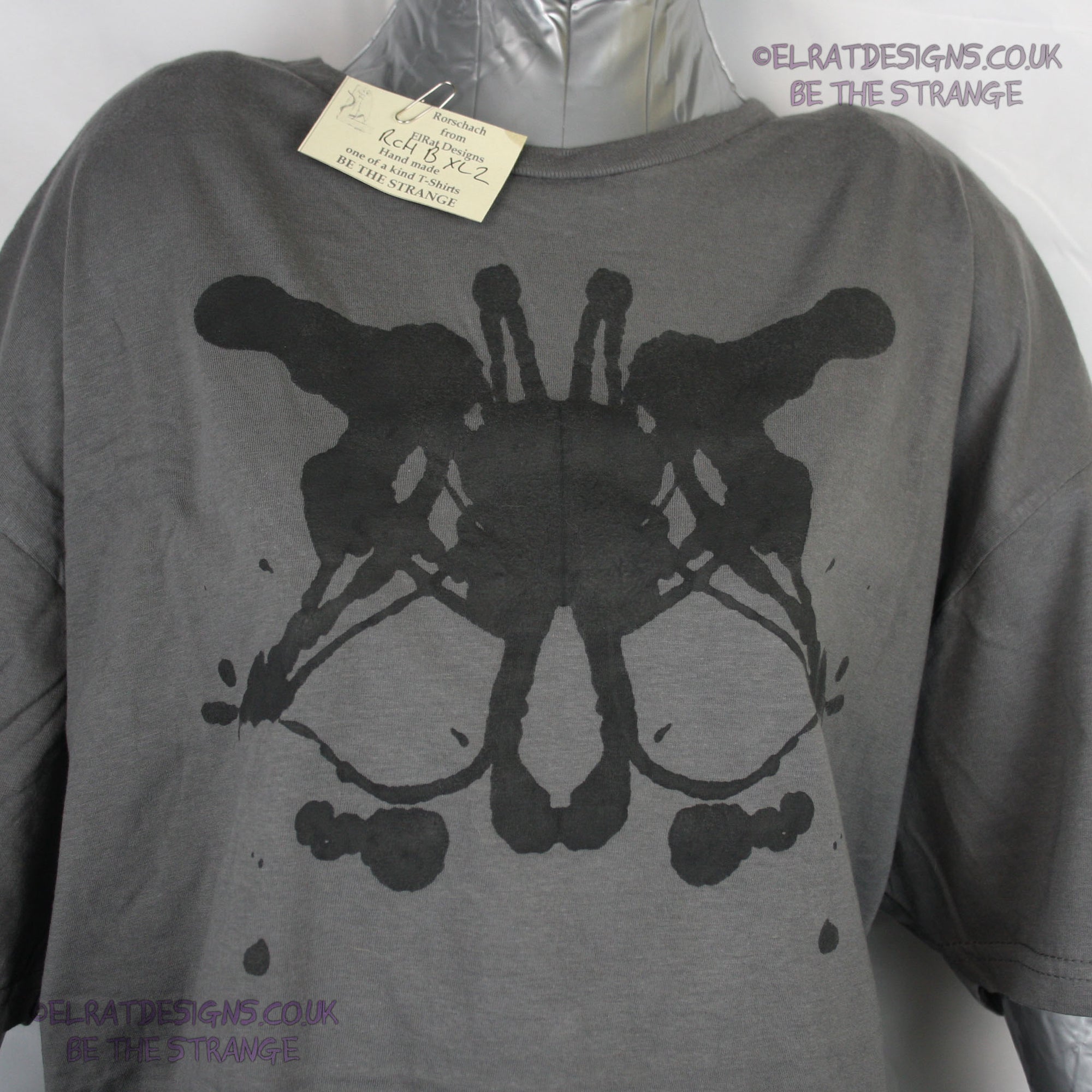 Many years ago I made myself a Rorschach T-shirt, I loved it, it sparked many interesting conversations but it was a pain to make, so for a long long time I was wondering how I could recreate this for other people. I finally cracked it . This is a genuine one-off ElRat Designs Rorschach ink blot t-shirt - there will never be another one exactly like this. Not screen printed, I use specially made foldable screens and let the ink create its own pattern, just like the original Rorschach test. What you see in the blot is a view into your mind - Everyone sees something, for some it's butterflies, others see faces, some see abstract shapes. In mine, I saw Walter White from Breaking bad, I made one for my kid, and it was a crab wearing a gas mask. There's no right or wrong answer.