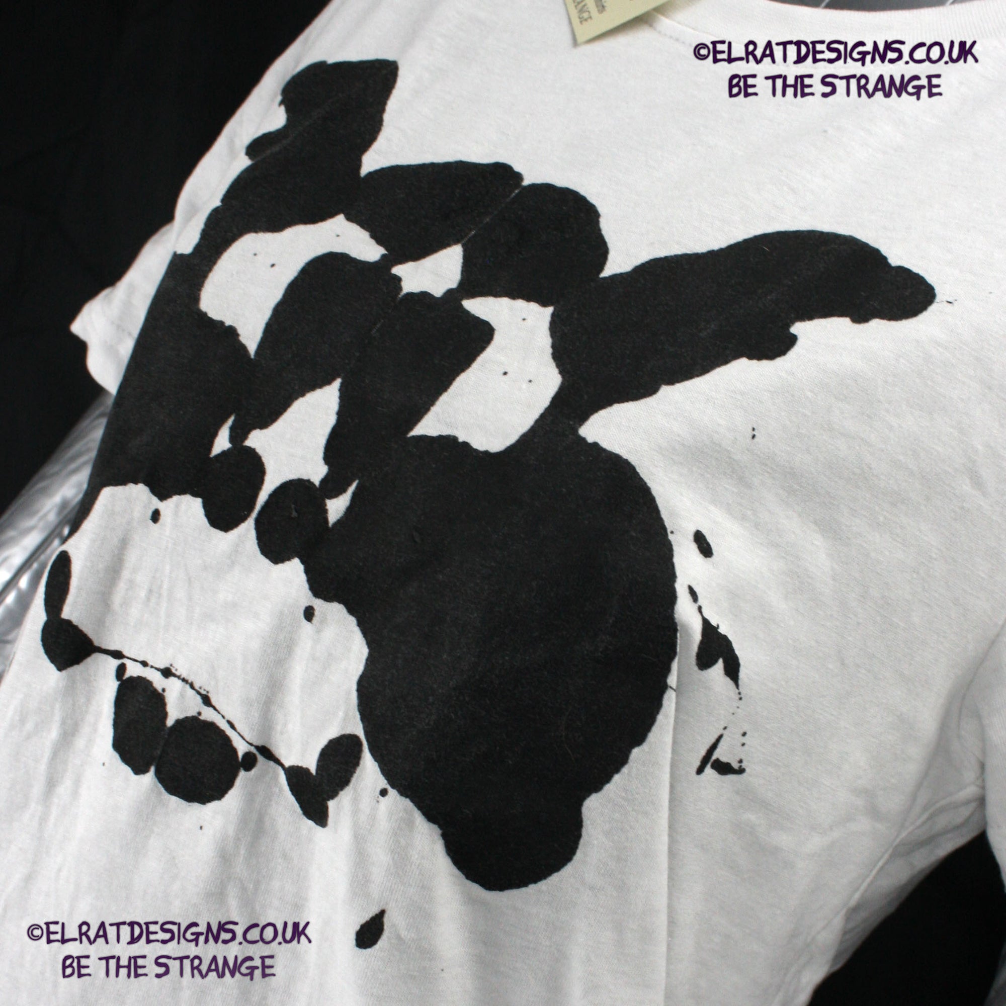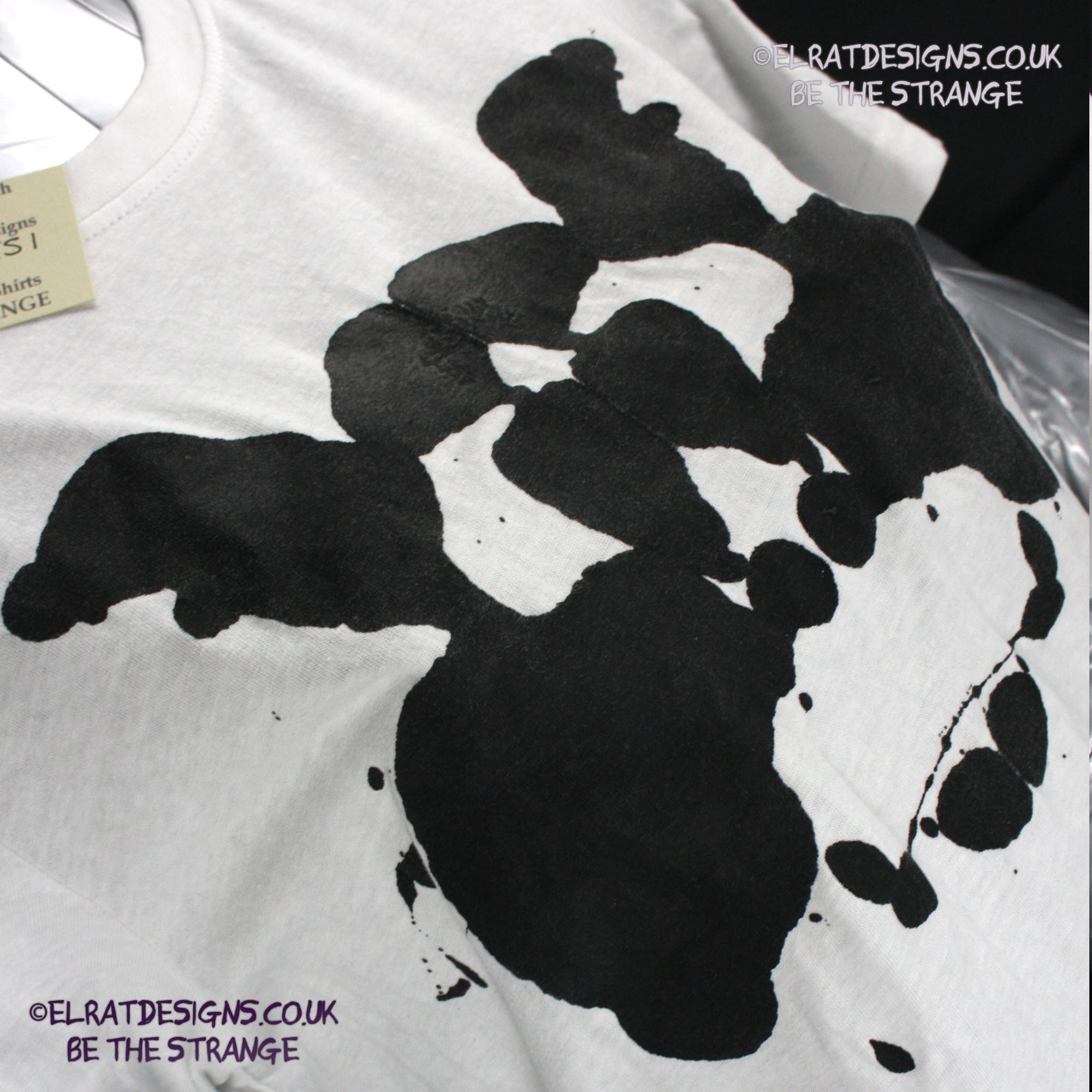Many years ago I made myself a Rorschach T-shirt, I loved it, it sparked many interesting conversations but it was a pain to make, so for a long long time I was wondering how I could recreate this for other people. I finally cracked it . This is a genuine one-off ElRat Designs Rorschach ink blot t-shirt - there will never be another one exactly like this. Not screen printed, I use specially made foldable screens and let the ink create its own pattern, just like the original Rorschach test. What you see in the blot is a view into your mind - Everyone sees something, for some it's butterflies, others see faces, some see abstract shapes. In mine, I saw Walter White from Breaking bad, I made one for my kid, and it was a crab wearing a gas mask. There's no right or wrong answer.